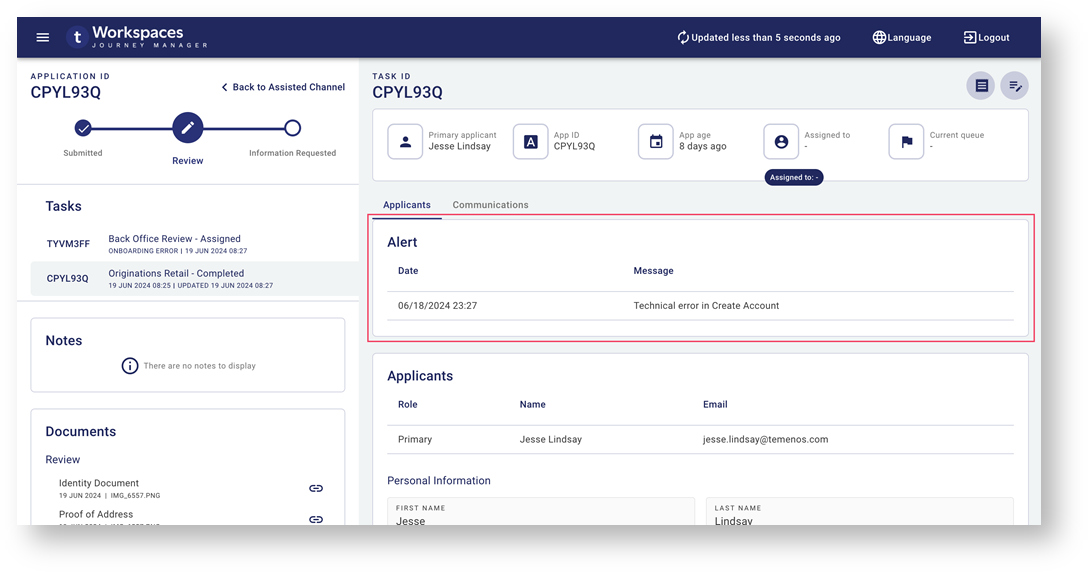 - Non-STP - These applications are processed automatically and require no manual intervention. These applications may encounter onboarding errors. To understand and handle these errors, navigate to the Helpdesk space and check the Alert card (see below). This card provides specific information about the error, enabling quick diagnosis and resolution.