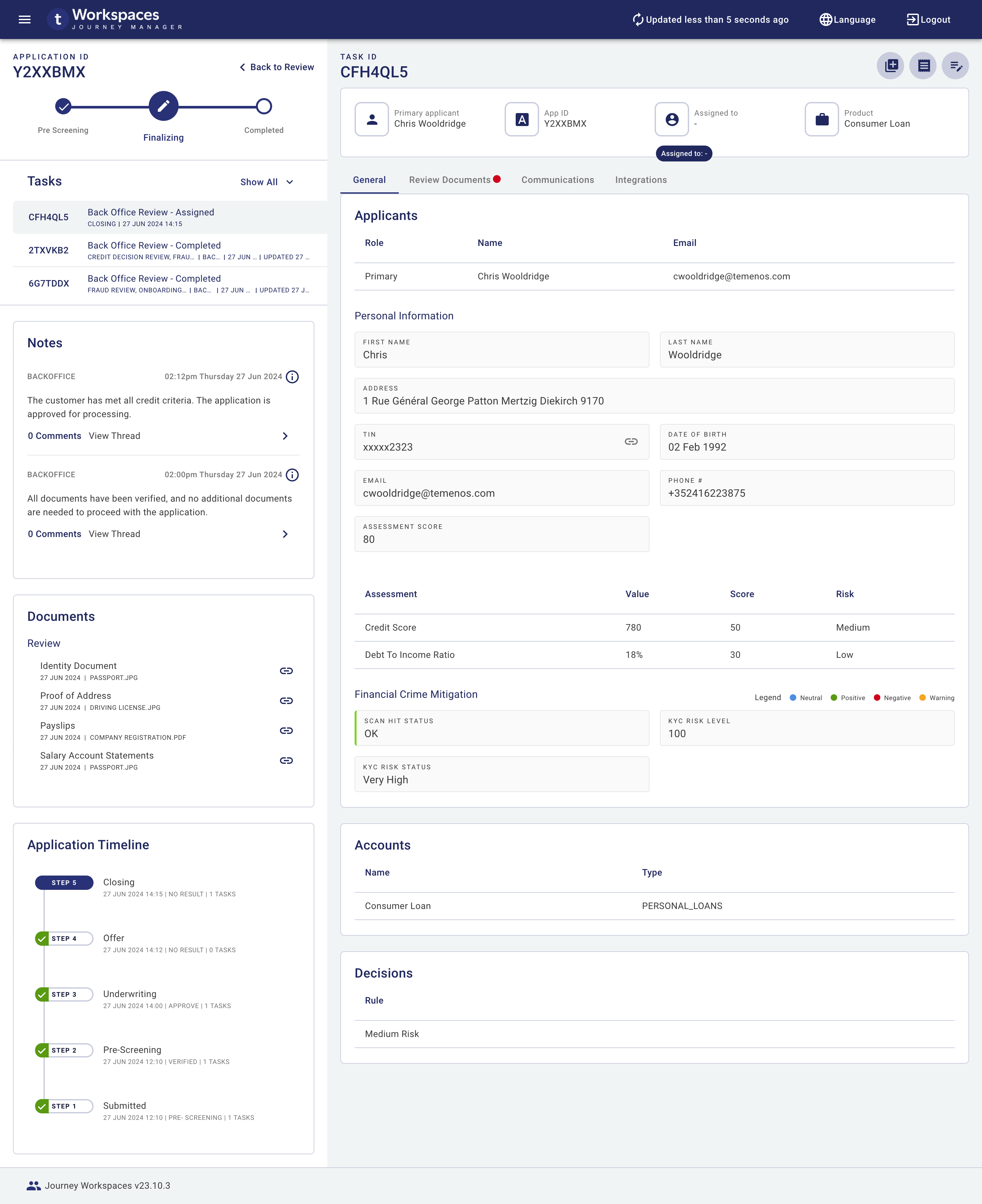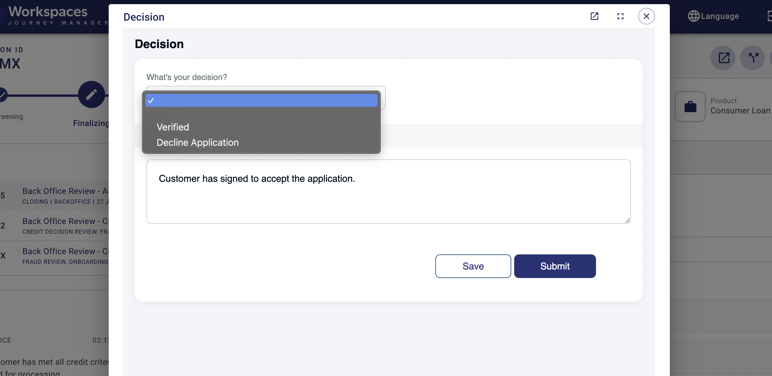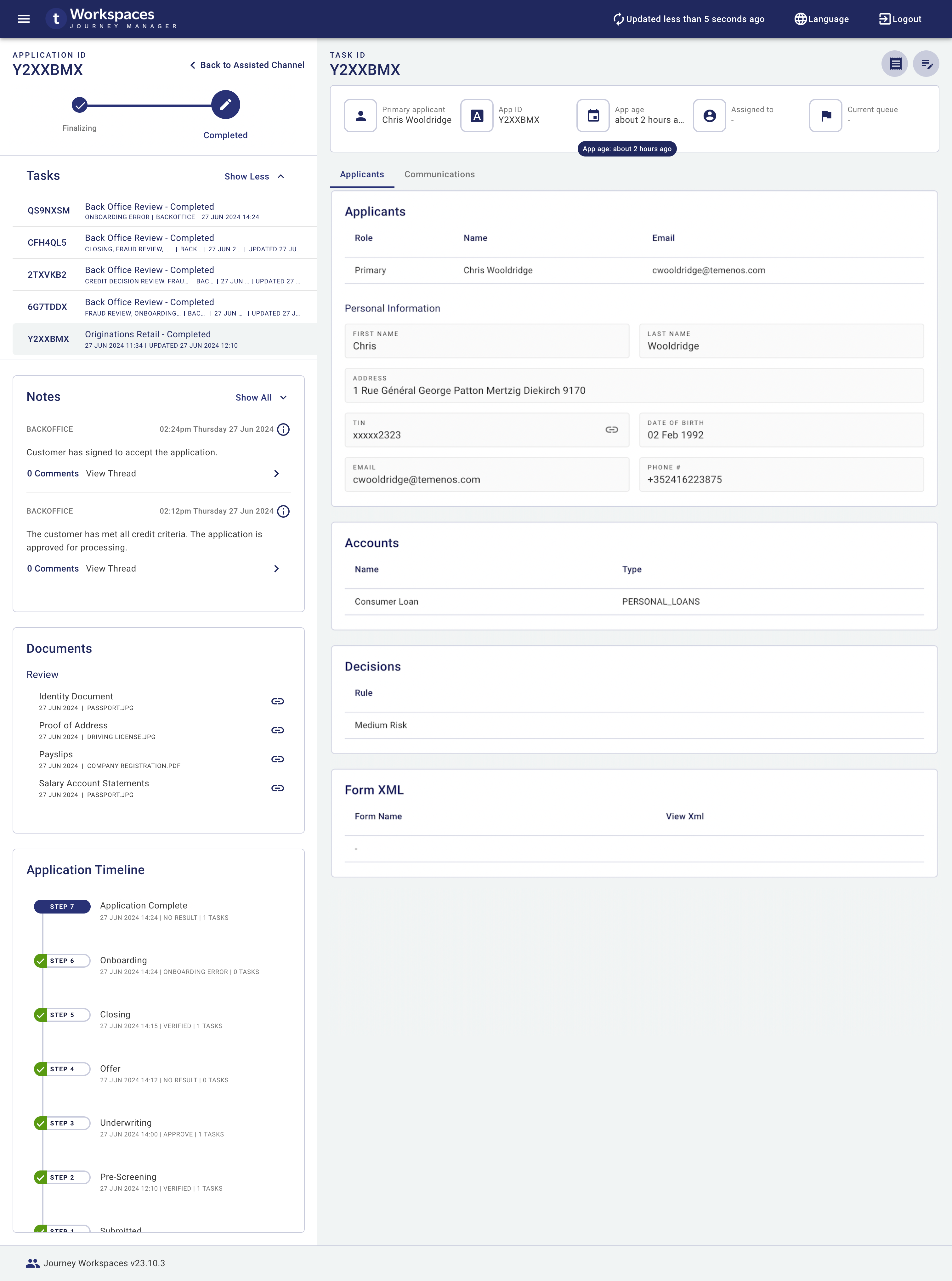Workspaces is a secure and efficient portal designed specifically for authenticated bank staff, and is the post submission module used in the Retail Onboarding application.