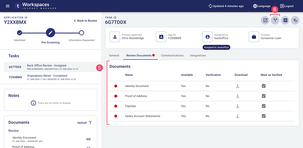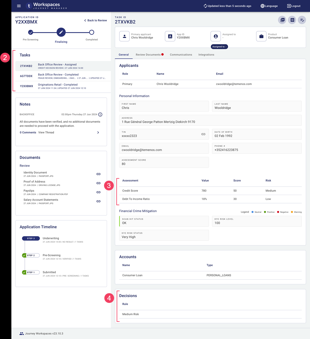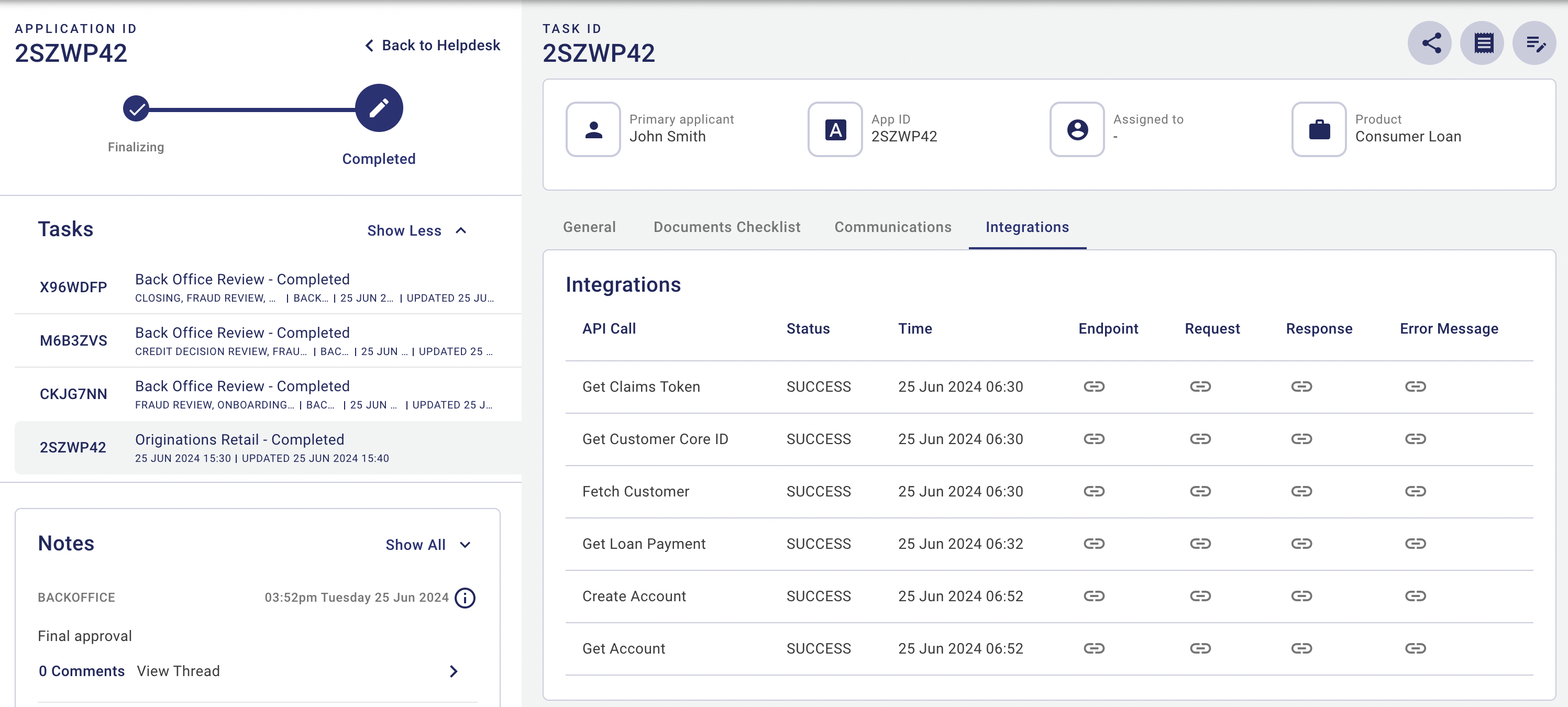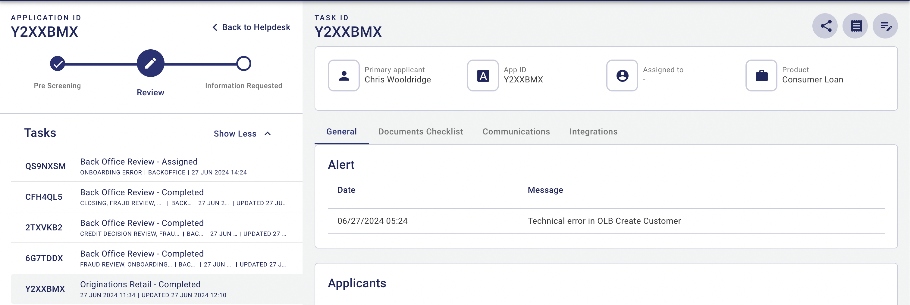 - The current task is assigned to the back office for review of the credit decision. Staff members need to check the tasks assigned to ensure they are reviewing the correct applications.