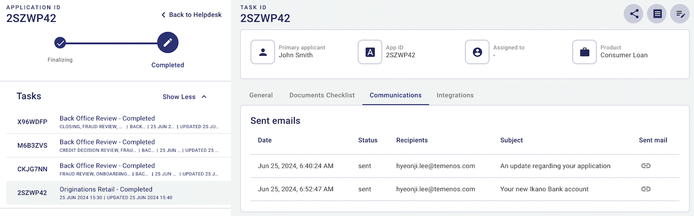- Click on the Communications tab to view the content of emails sent to the customer. This can help you verify ongoing communications and address any concerns raised by the customer.