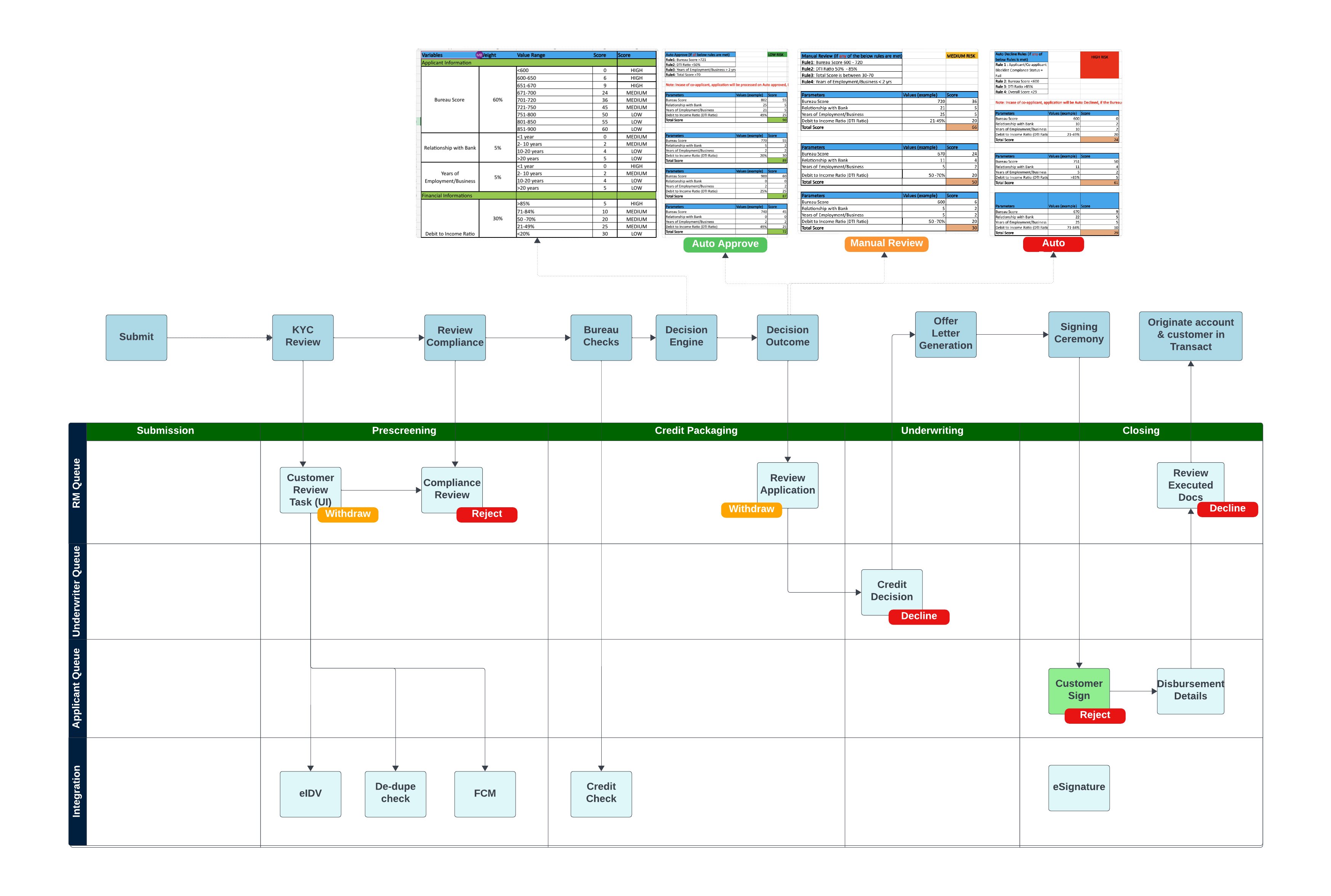 - Process Review - This space is for processing staff and relationship managers (RMs) to view and claim any pending tasks to move applications forward. Tasks may include reviewing customer documents, approving underwriting stages etc.