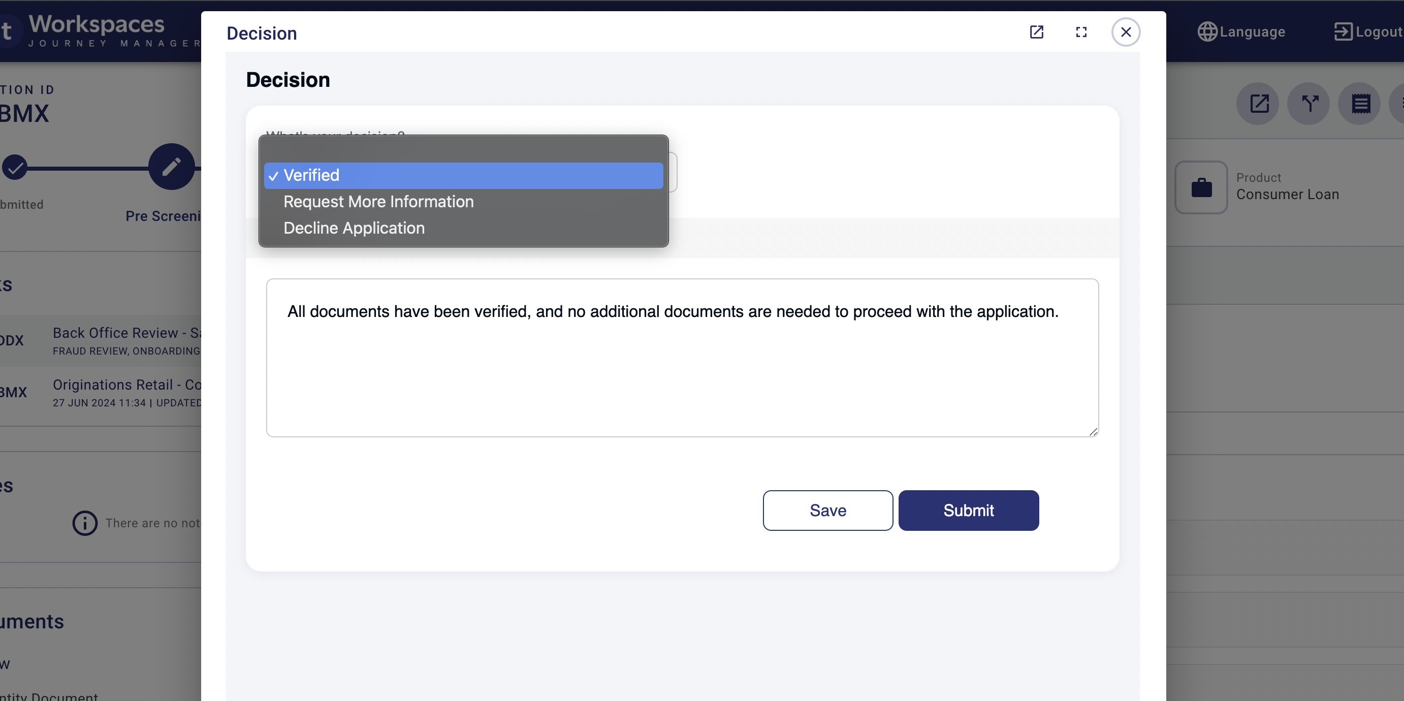 - To complete the prescreening stage, click Decision to make a decision. Select the appropriate decision from the options provided. If more information is needed, an email will be automatically sent to the customer requesting the necessary details.
