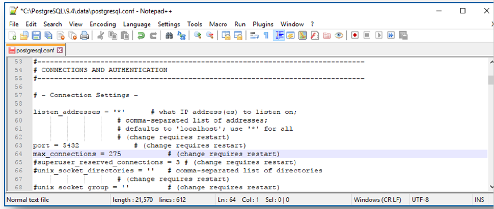 To force this change to take effect we just need to restart the PostgreSQL Windows Service.