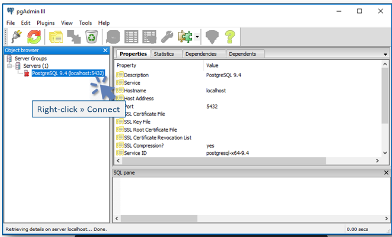 - Right-click Server PostgreSQL 9.5 (localhost:5432) > Connect.