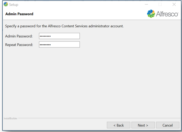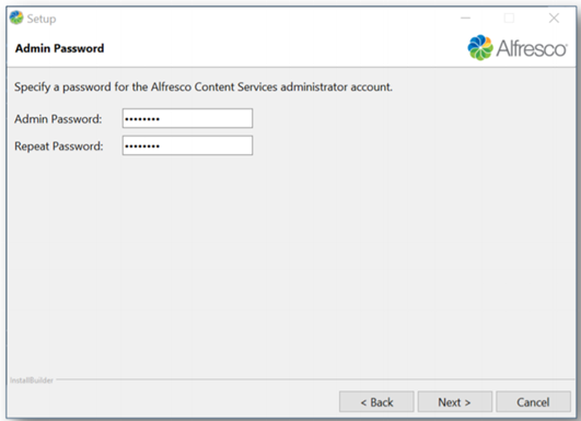 - Admin Password: Specify a password for the Alfresco administrator account.