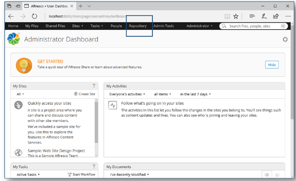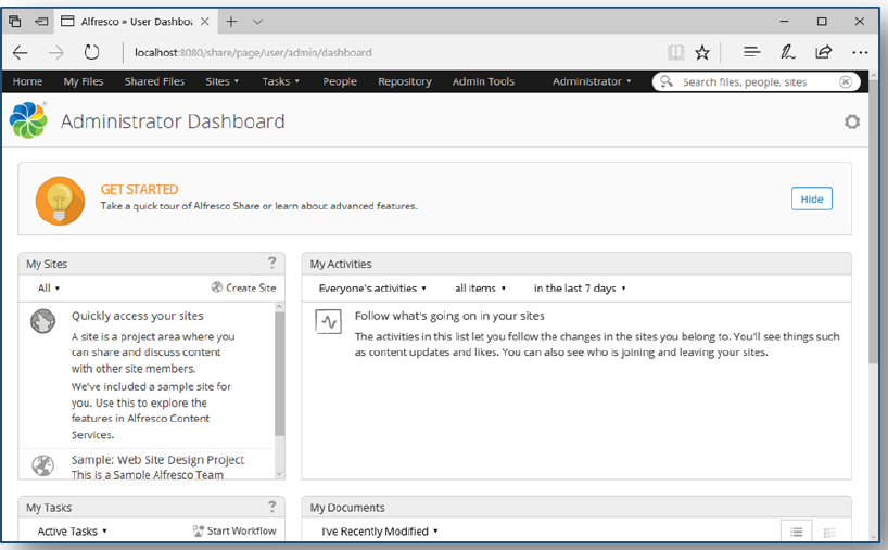 - Click Sign In button. The Alfresco Administrator Dashboard is displayed. This confirms that Alfresco is able to talk to PostgreSQL.
