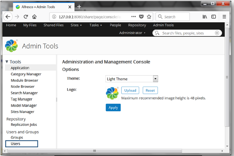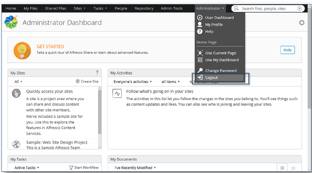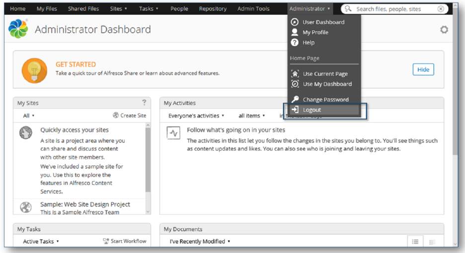 - Select Administrator menu > Logout to close the Alfresco Administrator Dashboard.