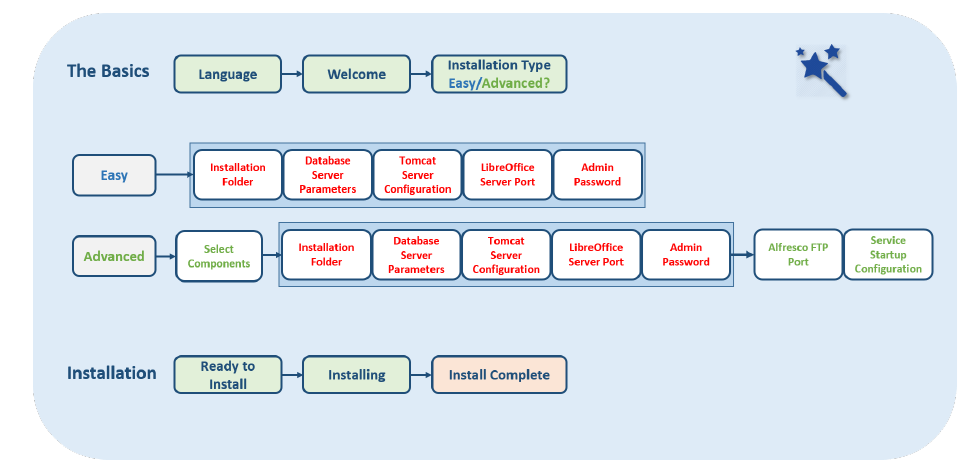 - Welcome: Displays “Welcome to the Alfresco Community Setup Wizard”.