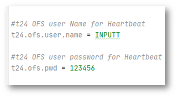 - To handle the heartbeat request message, the property below has been added. The username and password should be updated based on the Temenos Transactenvironment.