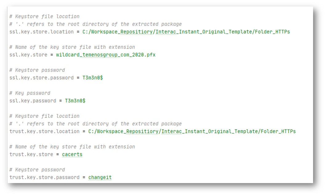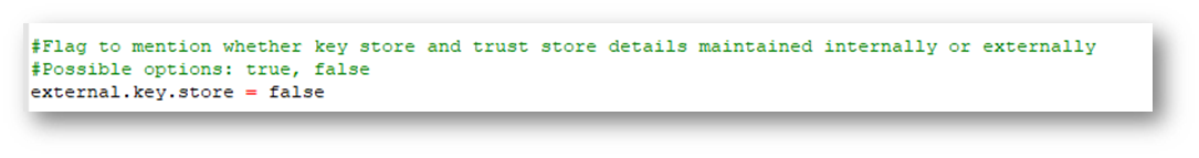 - SSL configuration details required for HTTPS connection: The location and password of the key store and trust store can be maintained in the local folder structure or this can be stored in the client desired location. This is indicated with a flag as: “external.key.store”.