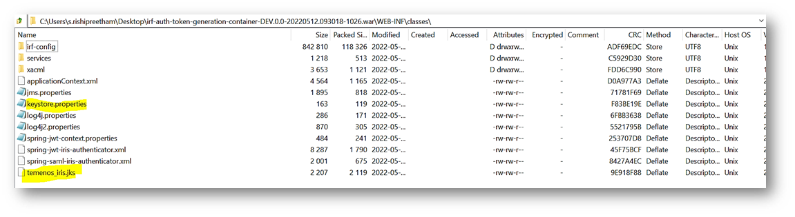 - Inside the war file, under the WEB-INF > Classes be found the keystore.properties and temenos_iris.jks files.