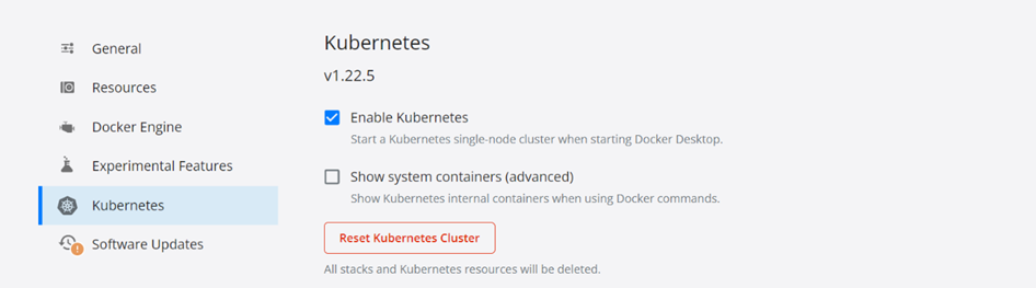 - Start Kubernetes, in this example, we use the Kubernetes provided by the Docker desktop.