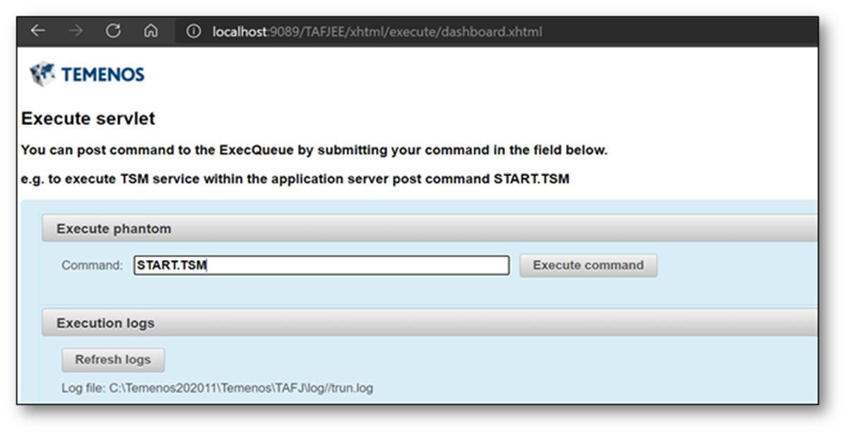 - The TSM needs to be started via TAFJEE (in case of TAFJ). Type START.TSM in the Command field and click on the Execute command button to start TSM. An example screenshot is given below.