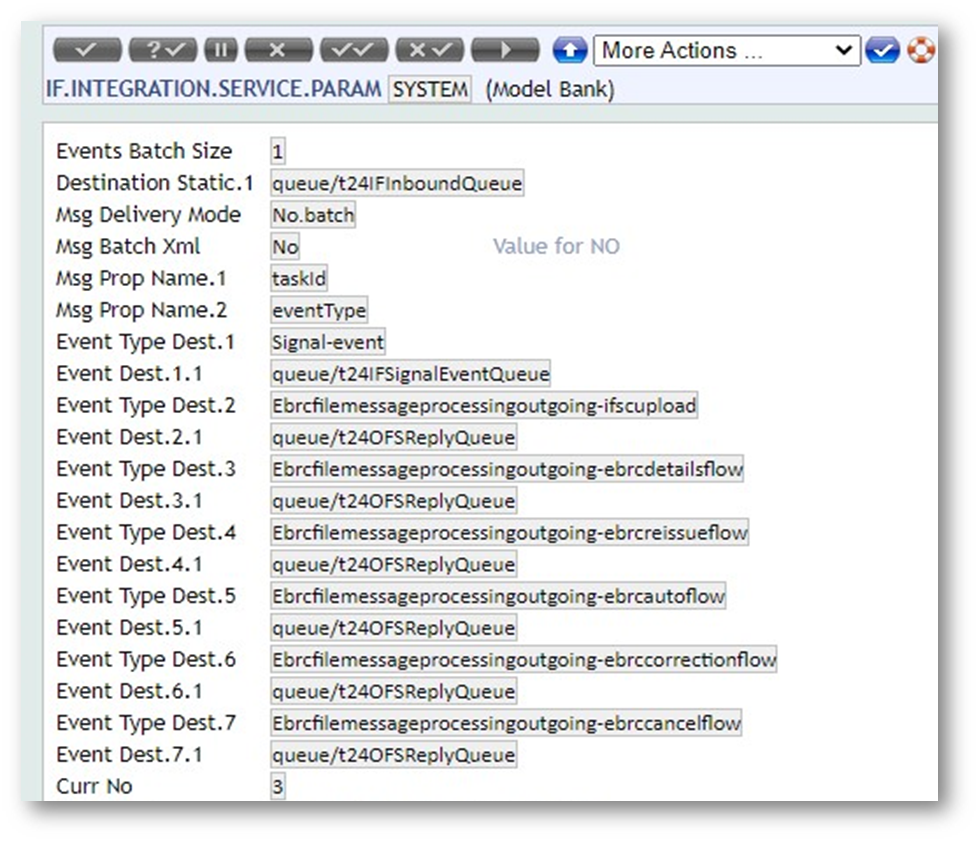 - The event queues must be configured in the SYSTEM record of the IF.INTEGRATION.SERVICE.PARAM application. A sample configuration is given below.