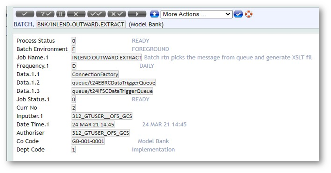 - The trigger queues needs to be configured in the BNK/INLEND.OUTWARD.EXTRACT record of the BATCH application (the prefix BNK can differ based on the client area). A sample configuration is given below.