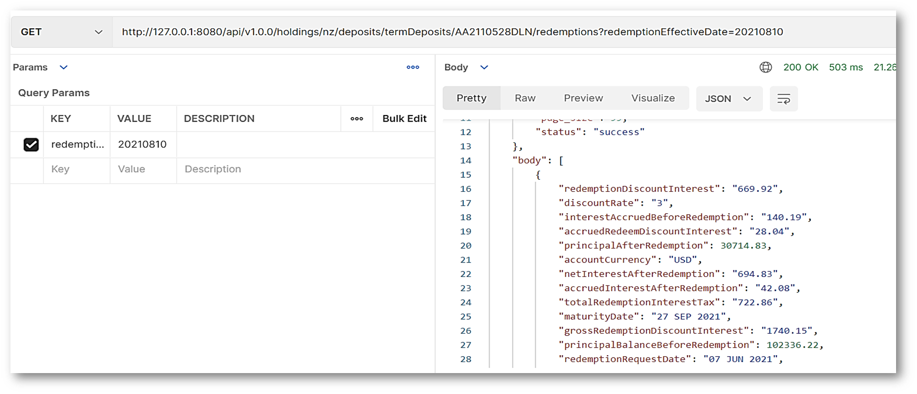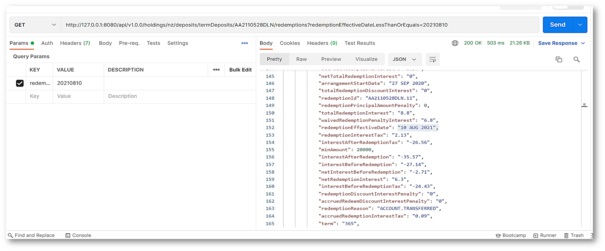 For Equals: http://127.0.0.1:9089/NZDEPO_Redemption_Container/api/v1.0.0/holdings/nz/deposits/termDeposits/AA2110548R4K/redemptions?redemptionEffectiveDate=20210810