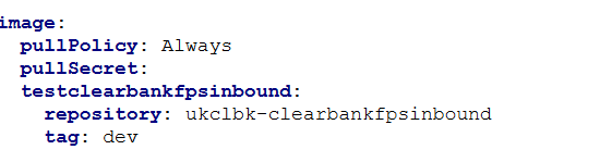 - Update the templates/ukclbk-clearbankfpsinbound-deployment.yaml with the image name as required in the sample below.