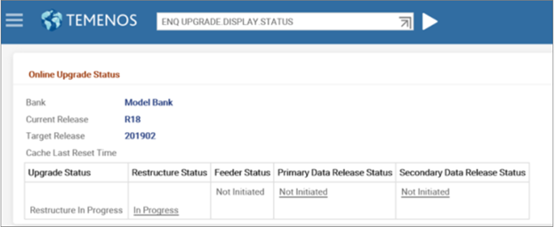 - After the release of primary data items, Primary Data Release Status changes to Completed and Upgrade Status changes to Secondary Records Release. This initiates the T24.UPGRADE service.