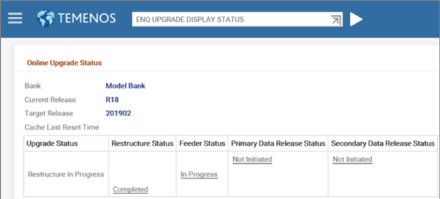 - Primary Data Release Status shows you the start and end time of the T24.UPGRADE.PRIMARY service.