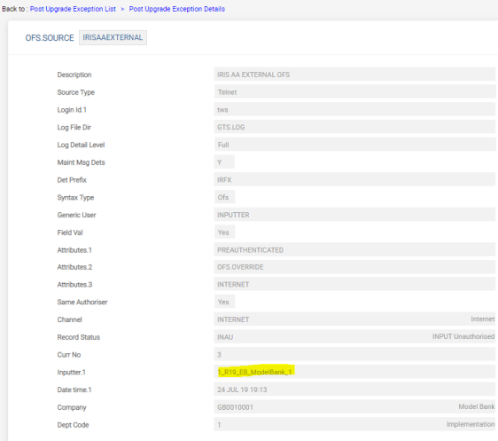 - Selection criteria with Application and Update set to OFS.SOURCE and <update id> respectively.