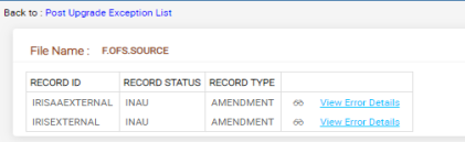 If the corresponding Temenos Transact.GENERIC.UPLOAD OFS.SOURCE record is setup to enable log (specific to the reporting purpose), the Temenos Transact.AUTHORISE service can update the authorisation failure details (if any) in OFS.REQUEST.DETAIL when authorising the exception records. If you configure a specific value in the Det Prefix field, the error details can be easily extracted using the View Error Details drill-down.