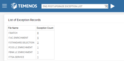 The POST.UPGRADE.EXCEPTION.LIST enquiry shows the list of data records released in exception. The following screen capture displays the list of data records released in exception without any selection criteria.