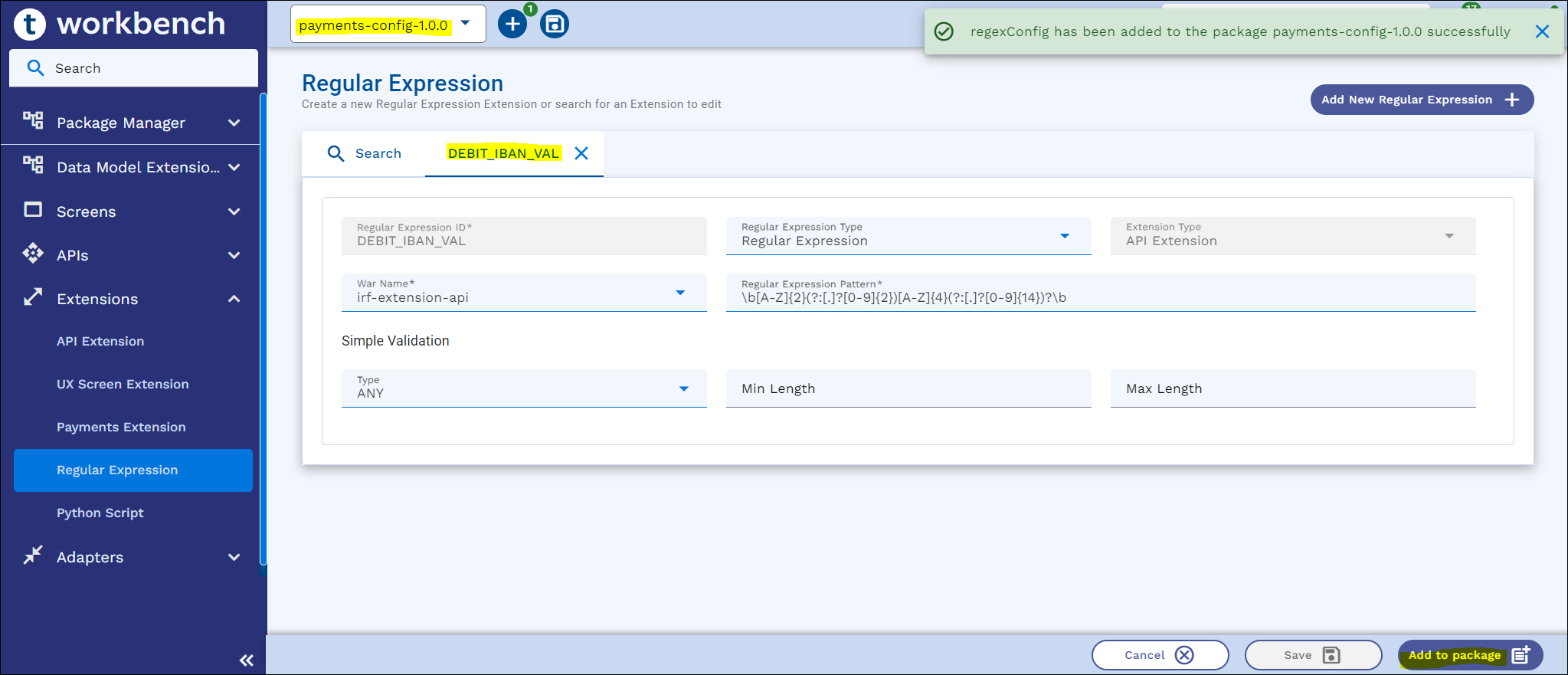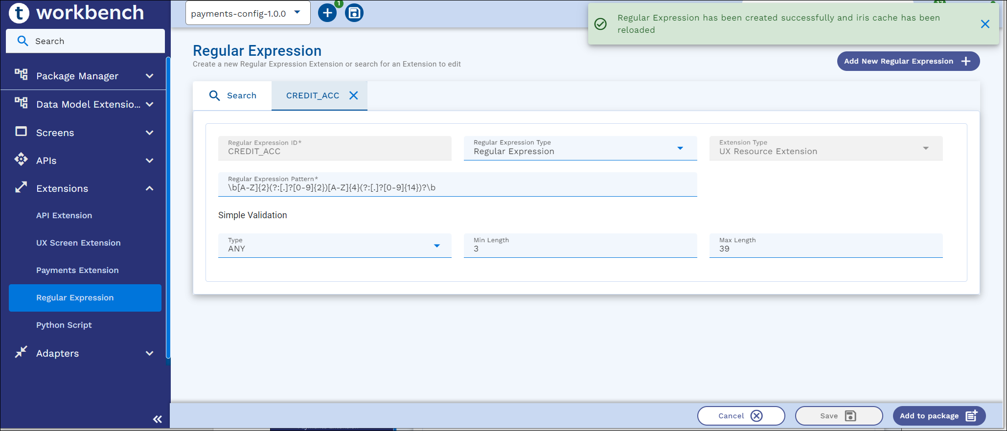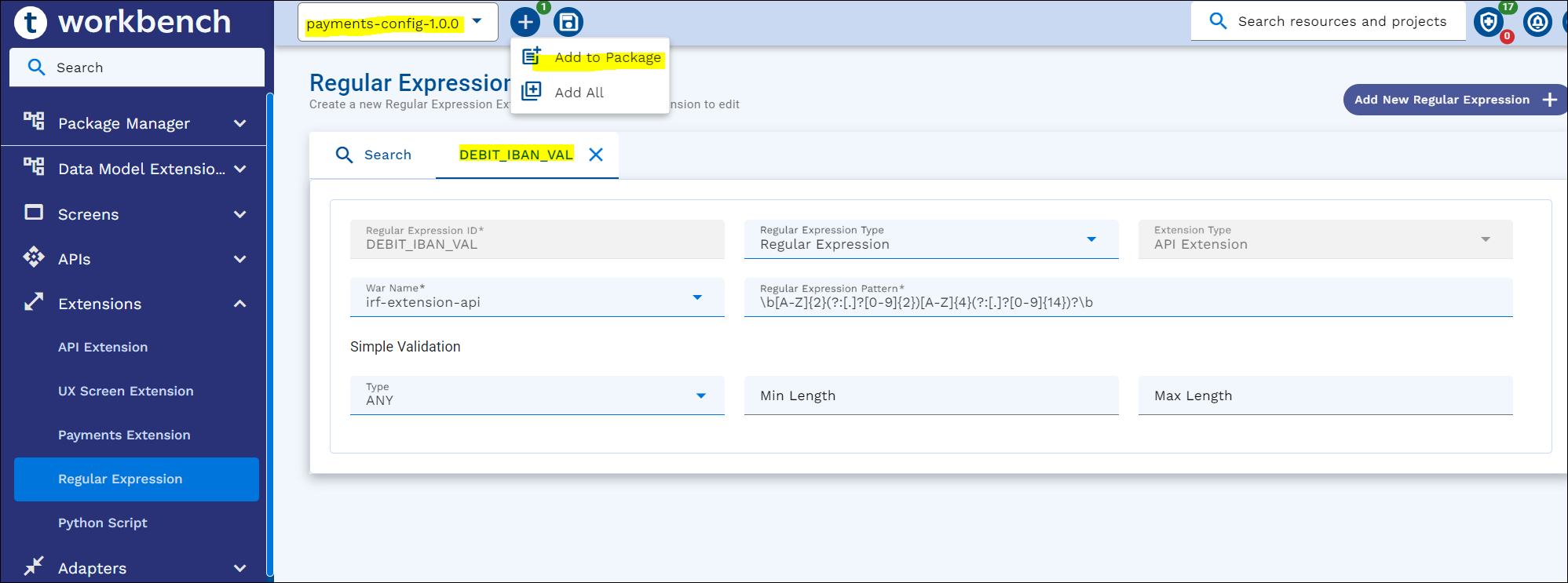 - On the appbar, click the ‘+’ icon and click either Add to Package/Add to Project, or Add All to add Regular Expressions to the package or project.