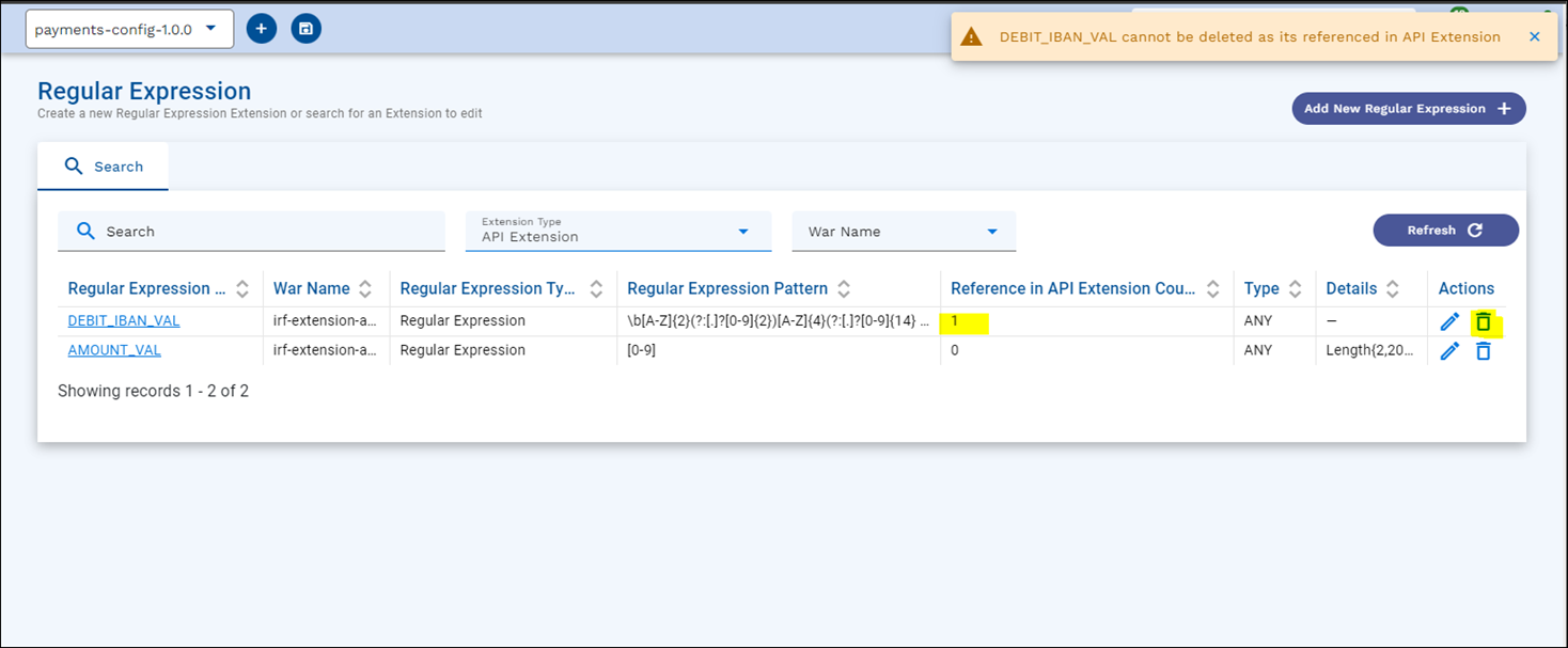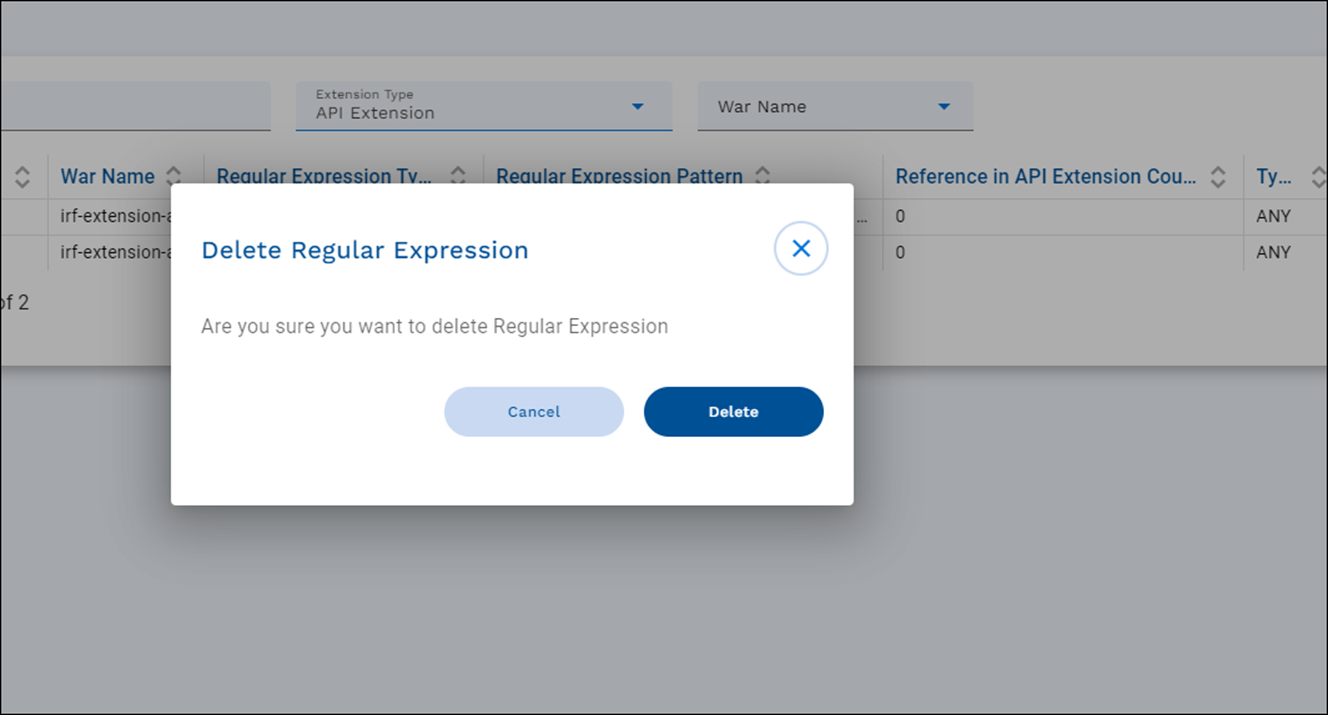 - In the Delete confirmation popup, click Delete. This deletes the regular expression from the config service.