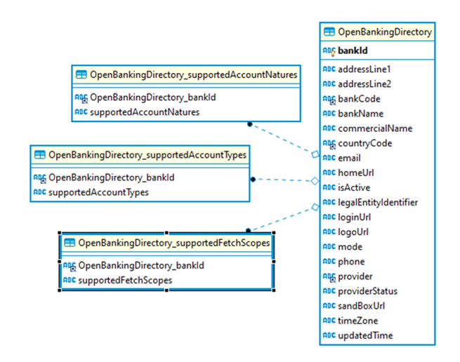 The Account Aggregation Microservices has multiple entities and each entity has a different role to play. The entity relationship diagram for Account Aggregation Microservice is shown below.