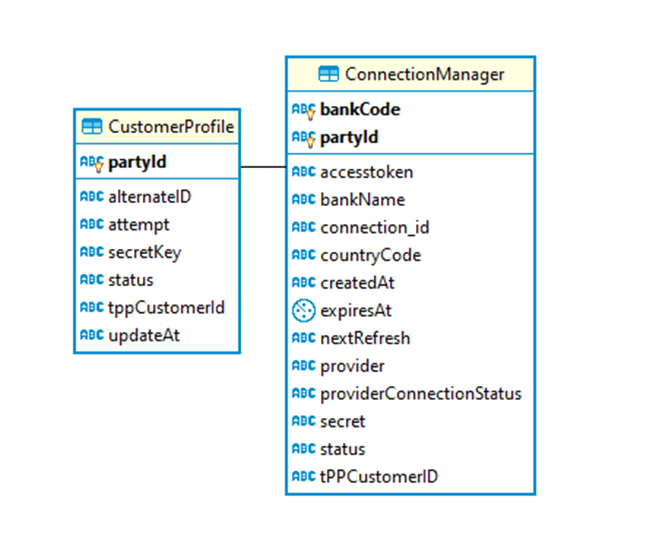The Connection Manager Entity stores the connection details for the customer and for the banks he has provided access to.