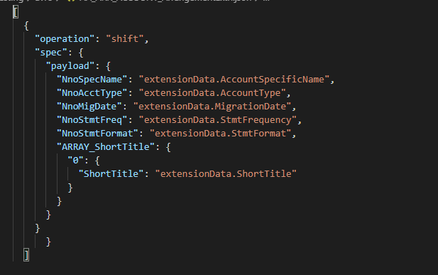 Below screenshot is used to update extension entity of arrangement, the file name of the spec file is "AA_ARR_ACCOUNT_ArrangementExtn.json".