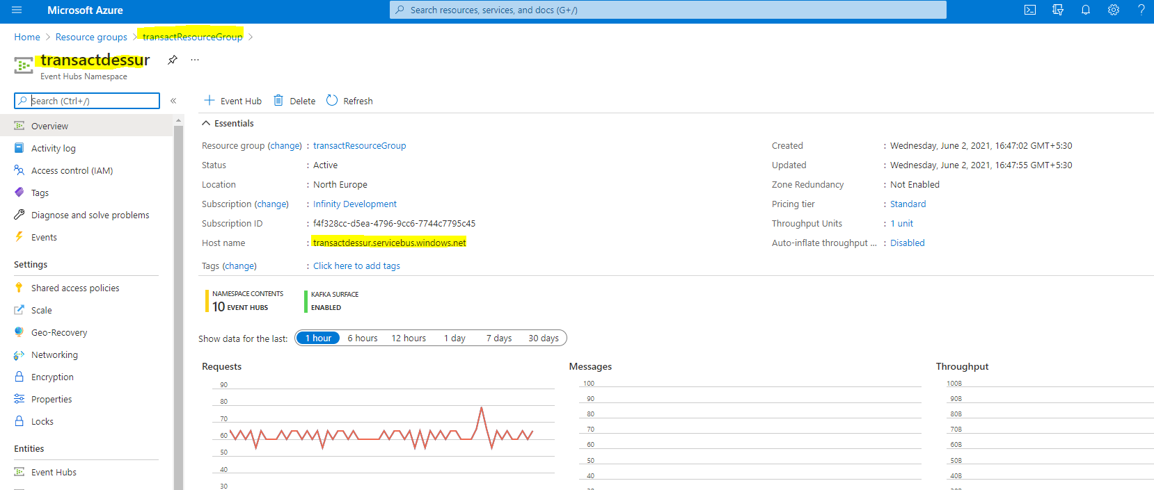 You can view the eventhub connecting to the created transactdessur.servicebus.windows.net:9093.