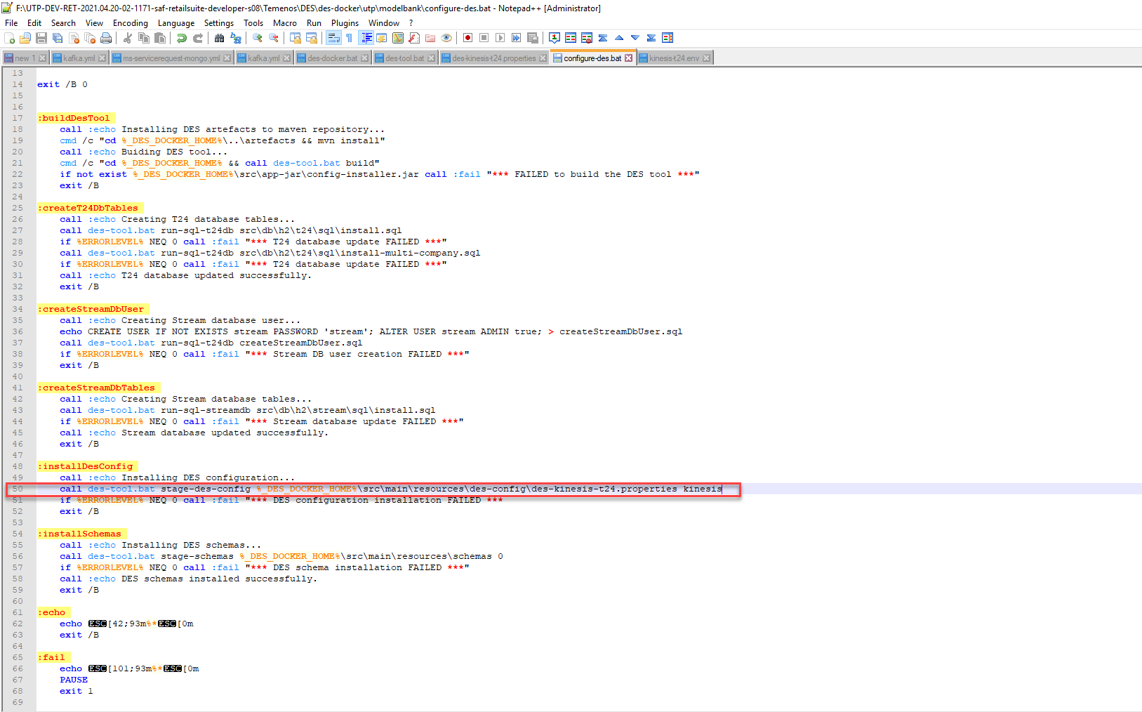 - Navigate to F:\UTP-DEV-RET-2021.03.04-01-1064-saf-retailsuite-developer-s08\Temenos\DES\des-docker\utp\modelbank\configure-des.bat. Update the des config file as shown in the below image highlighted in red: