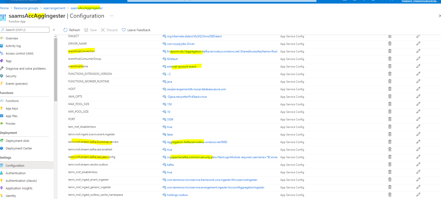- temn.msf.stream.kafka.bootstrap.servers should point to the Event Store EventHub.