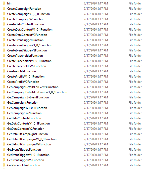 The folder structure of the Campaign Microservice is available as a single release bundle. For example, ms-campaign-package-azure-<release_number>.zip.