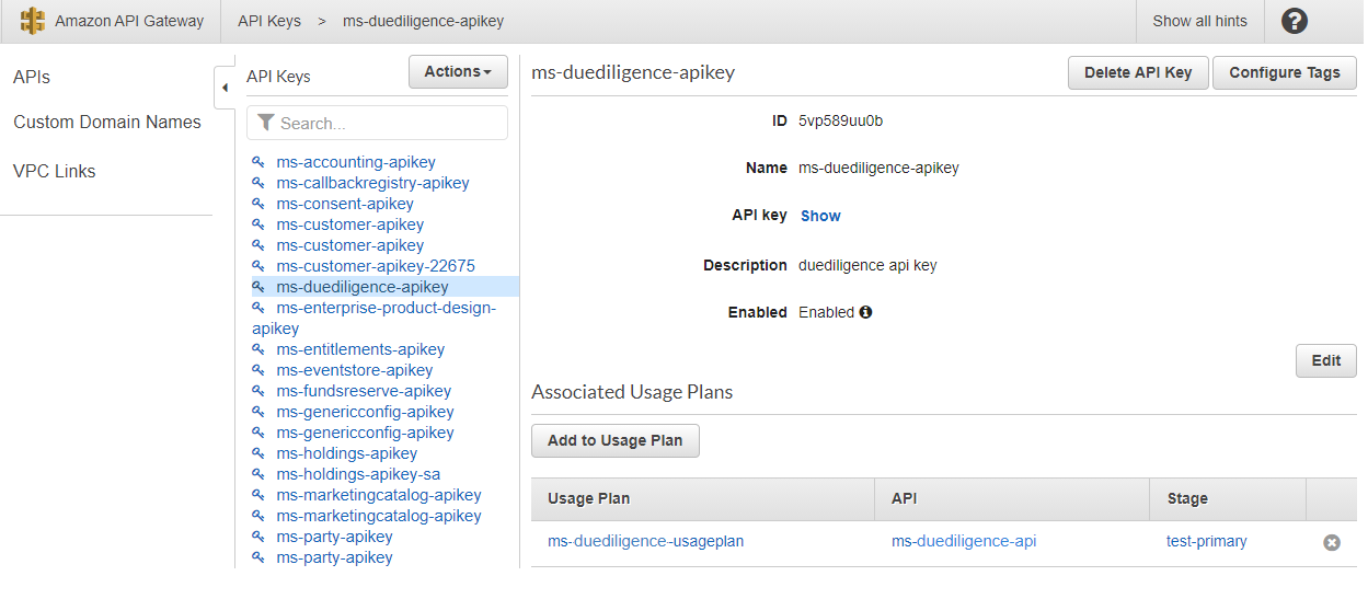 8. To obtain the API key for all the endpoints in AWS, go to the API Keys section under the Amazon API gateway and select the corresponding API key. Click Show.