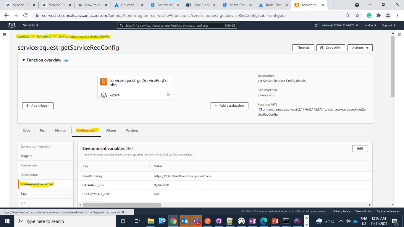 AWS properties can be validated based on the database against the sample values mentioned in Service-Request AWS Configuration.During the service request deployment, the user can find the Environment variables tab in the respective lambda function.