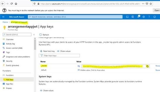 4. masterKeyToken rem command to get the master API token. call az rest --method post --uri "/subscriptions/%subscriptionid%/resourceGroups/%RESOURCE_GROUP_NAME%/providers/Microsoft.Web/sites/%APP_NAME%/host/default/listKeys?api-version=2018-11-01" | python -c "import json,sys;obj=json.load(sys.stdin); print(obj['masterKey'])" >> out.txt SET /p masterKeyToken=< out.txt.