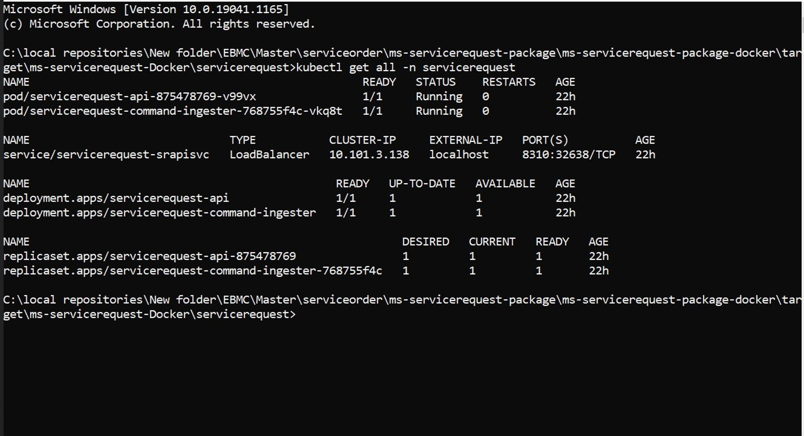 - Once the services are up and running, perform kubectl get all -n servicerequest to see all the resources for the particular Servicerequest microservice.