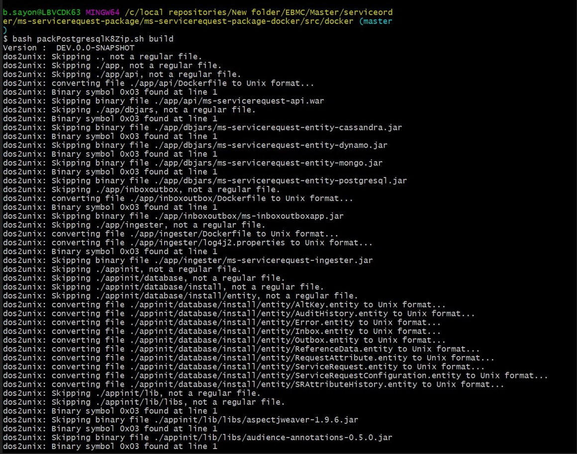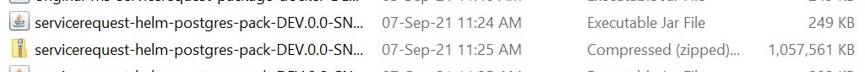 - After the build is completed, navigate to serviceorder\ms-servicerequest-package\ms-servicerequest-package-docker\target. The servicerequest-helm-pack-postgres-<release_number>.zip will be available.
