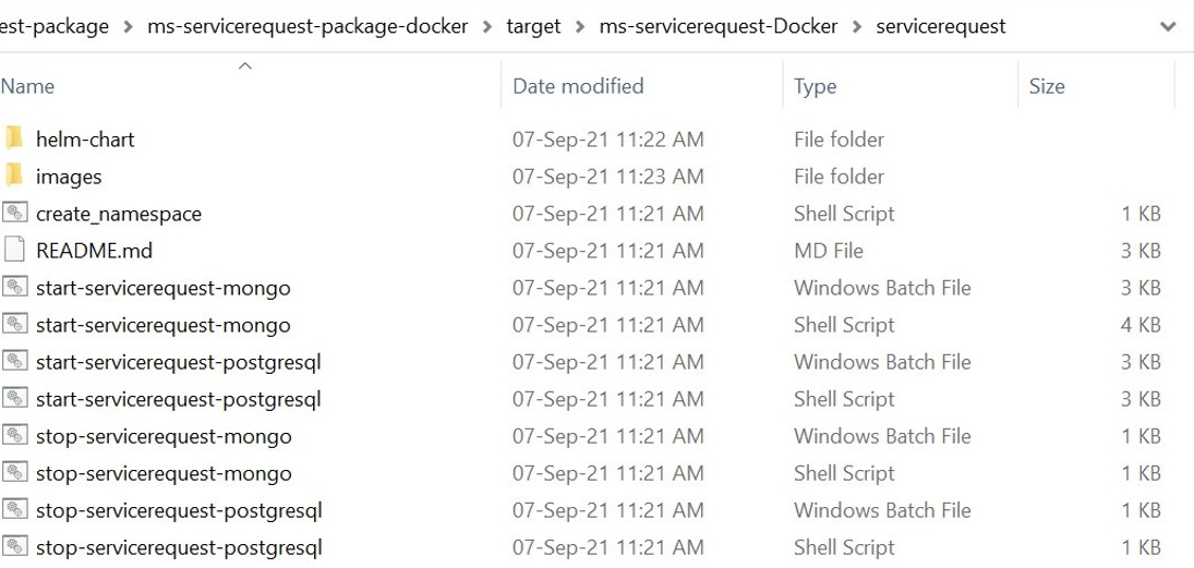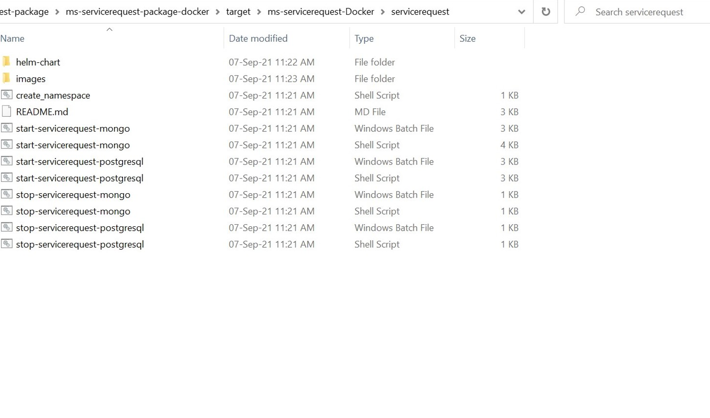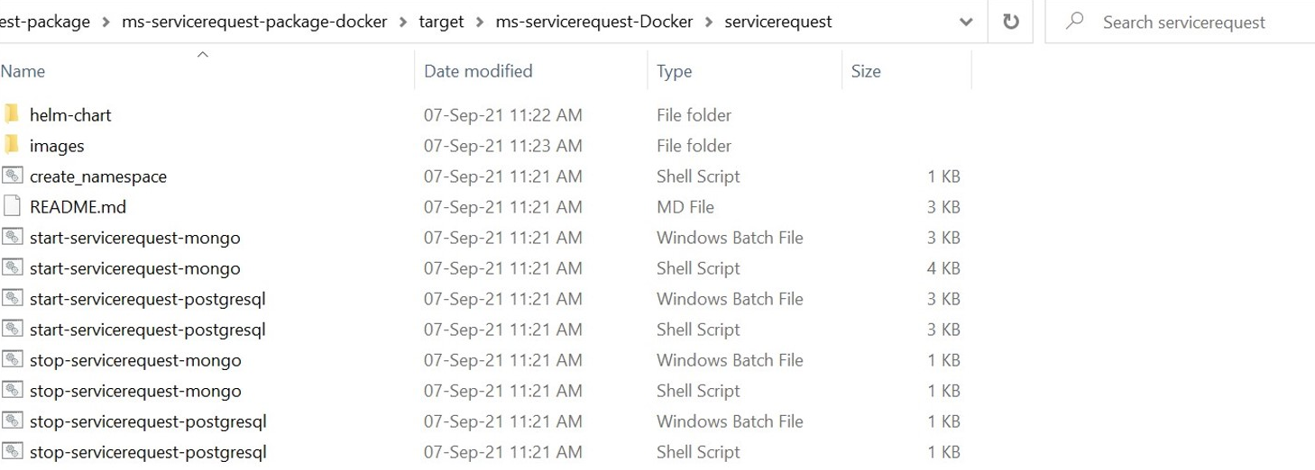 - After the build is completed, navigate to serviceorder\ms-servicerequest-package\ms-servicerequest-package-docker\target. The servicerequest-helm-pack-mongo-<release_number>.zip will be available.