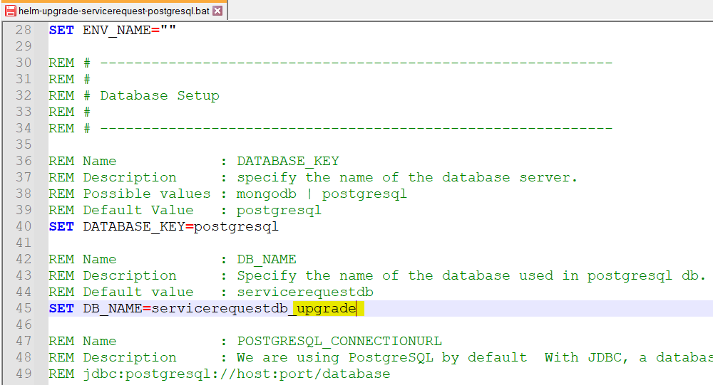 - Make the necessary changes in the helm upgrade script and save it. For example, the db_name can be updated.