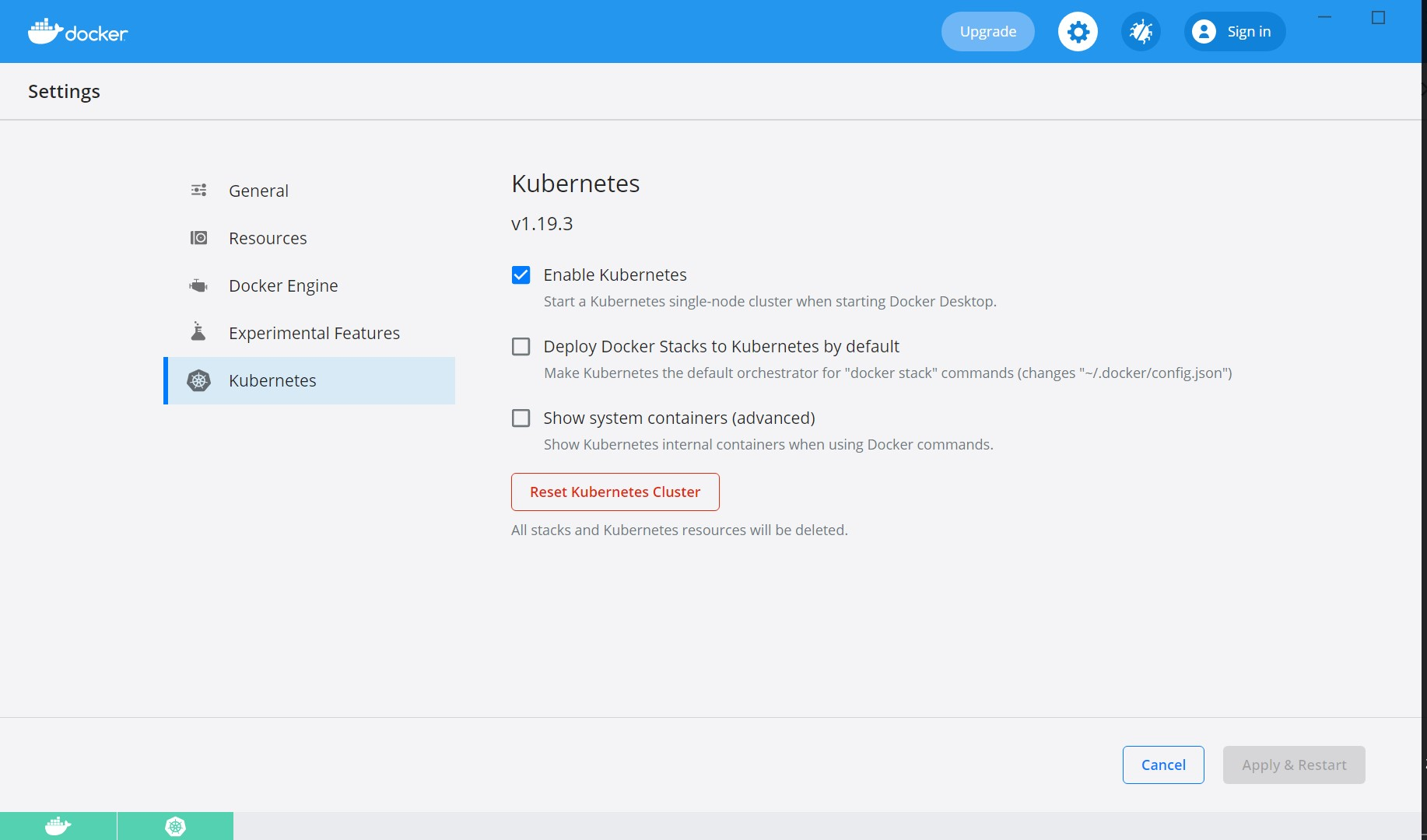 - After the docker is installed, enable Kubernetes in the Docker Desktop app.