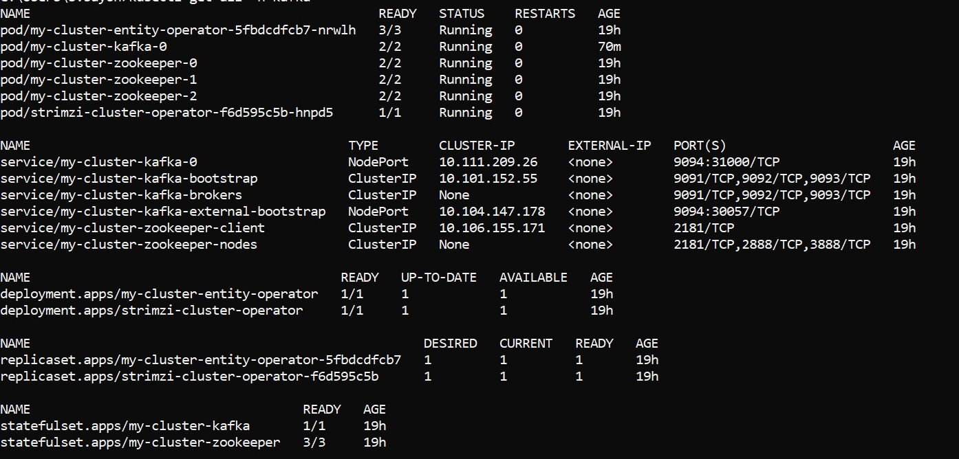 - Execute kubectl get all -n kafka in order to check all pods are up and running.