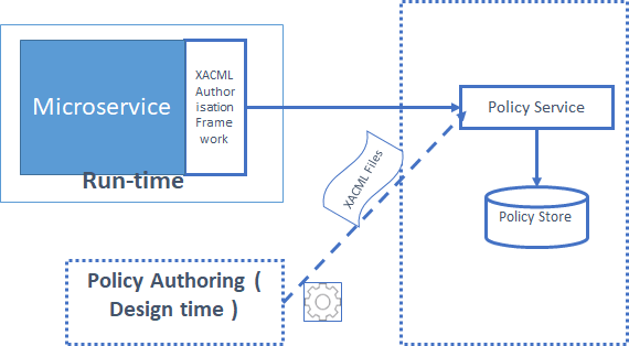 Microservices uses XACML implementation to let the client define authorization policies for the intended microservices. The client uses Policy Editor Design time to author XAML policies for microservices and deploy them on the policy store.
