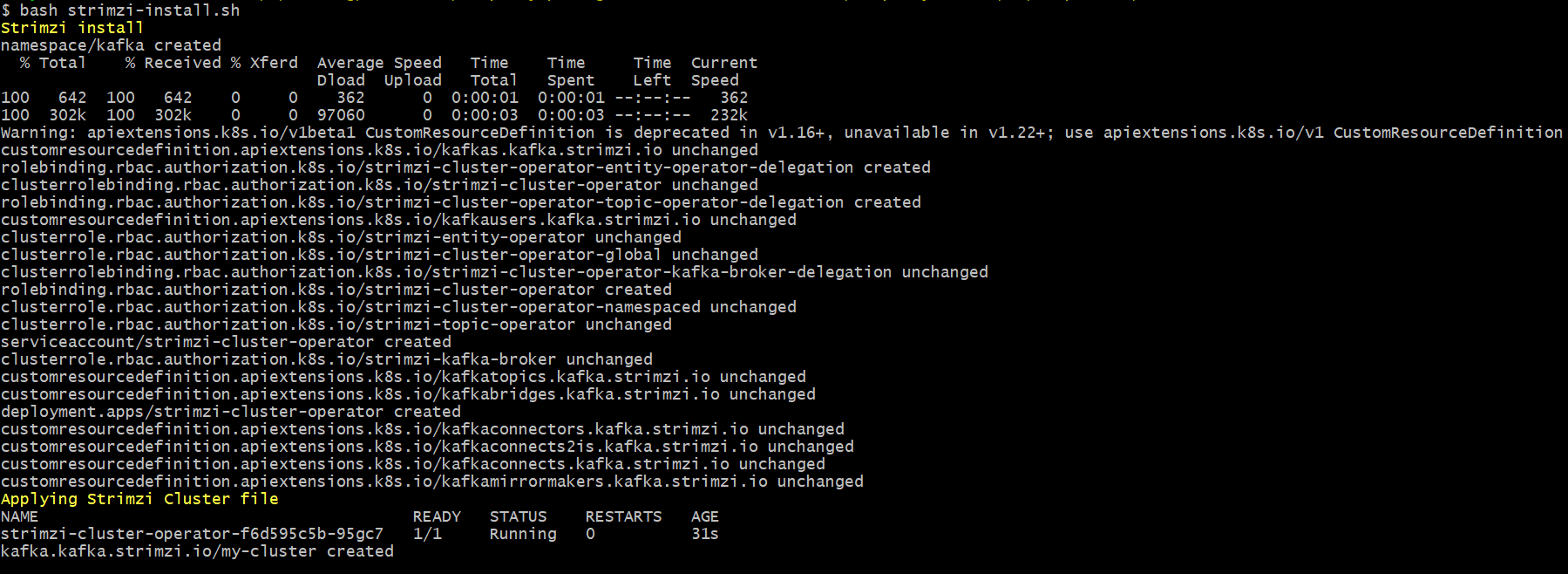 If Strimzi is not installed in the machine, navigate into the streams folder and run ./strimzi-install.sh .This is a one-time step and should be repeated if we reset Kubernetes cluster.