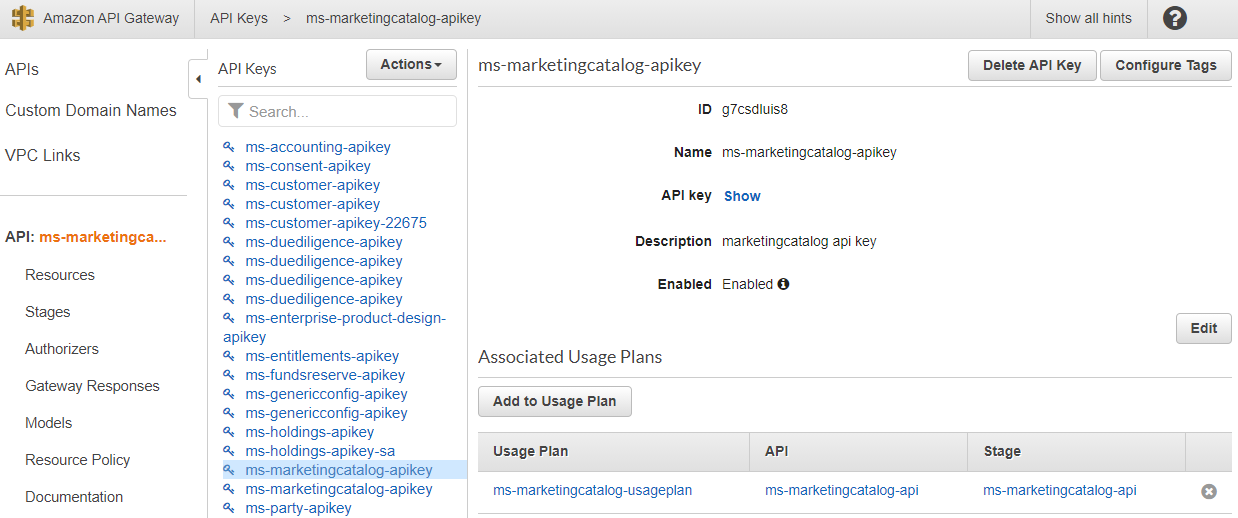 11. To obtain the API key for all the endpoints in AWS, navigate to API Key section under the Amazon API gateway and select the corresponding API key, then click on show. The API key has to be a part of header (x-api-key) in all the requests.