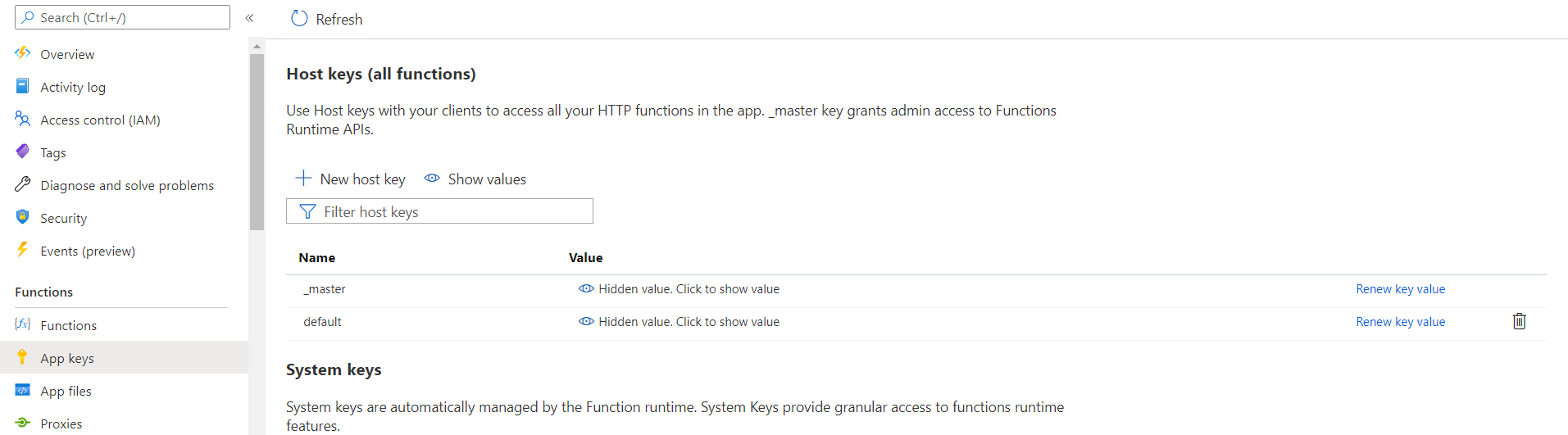 - API key for each endpoint in the function app can be obtained using the command, func azure functionapp list-functions <function-app-name> --show-keys or can be obtained alternatively, from the Azure function GUI.