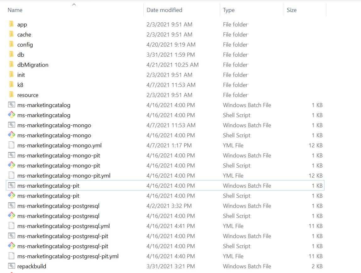 | ms-marketingcatalog-mongo.bat / ms-marketingcatalog-mongo.sh | To deploy all the necessary components for a Microservice including streaming services will be deployed, in order to run the Microservice independently. |