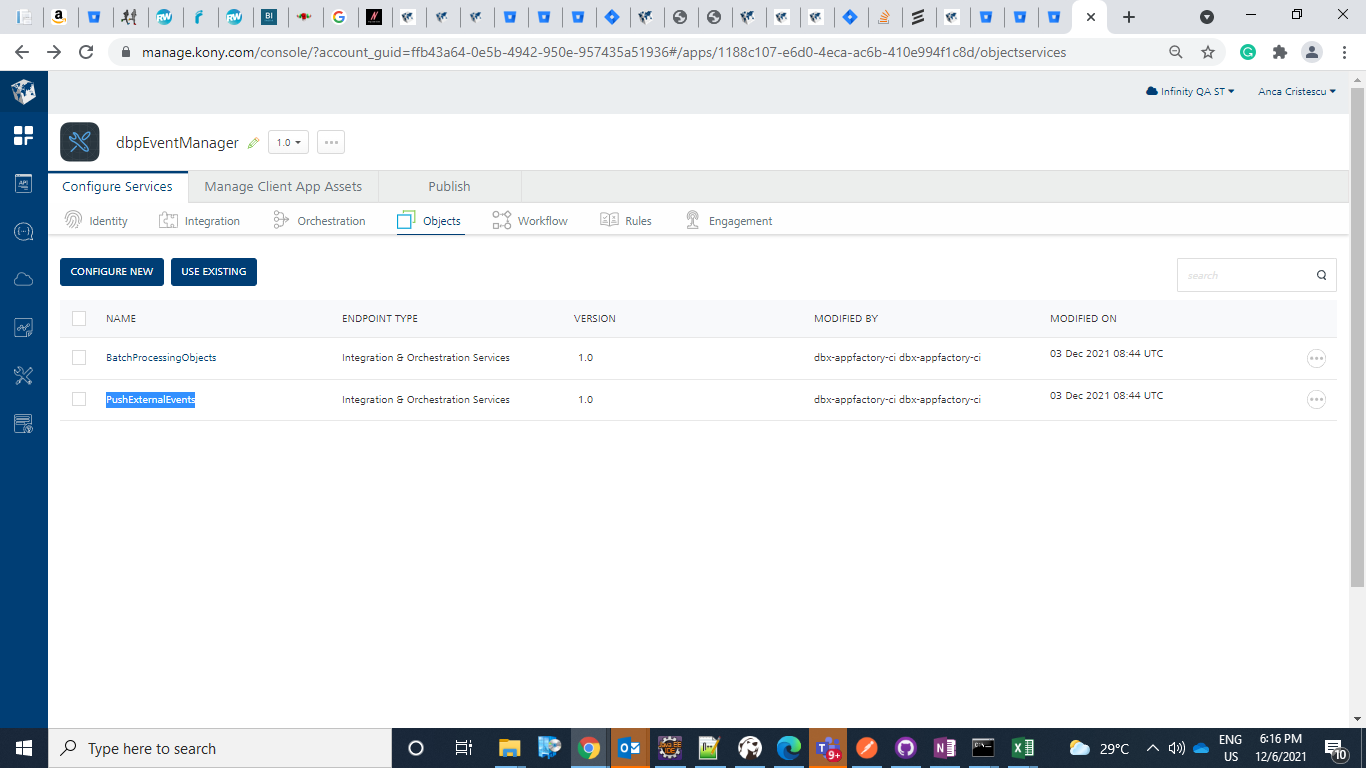 The XKonyAppKey, and XKonyAppSecret can be retrieved from fabric MF console. The dbpEventManager contains the userStore Identity service, and PushExternalEvents Object Service, where you can view for the PushExternalEvents Object service in API management console and find associated apps.